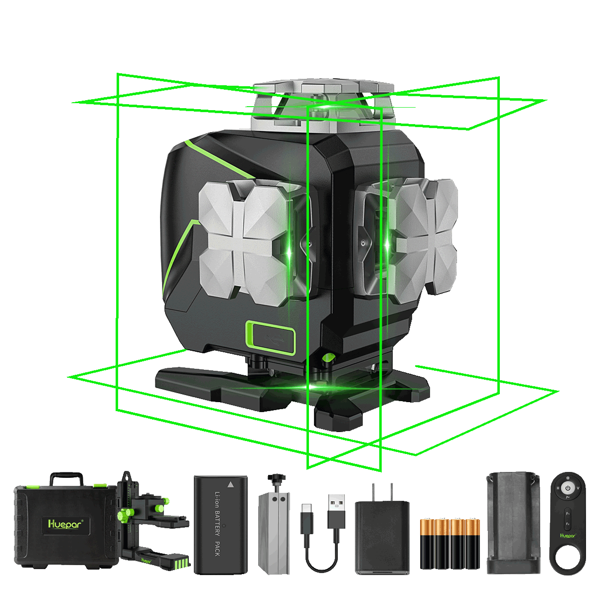 Huepar S04CG laser tool uses a large capacity Li-ion battery compatible with the Samsung SB-L110 battery. The Huepar 360 laser level also includes a holder for 4 AA batteries. The 16-line laser level can be used directly plugged in when the battery is removed. With a Type-C charging port, the laser level can also be charged by a laptop, power bank, car charger, etc.
